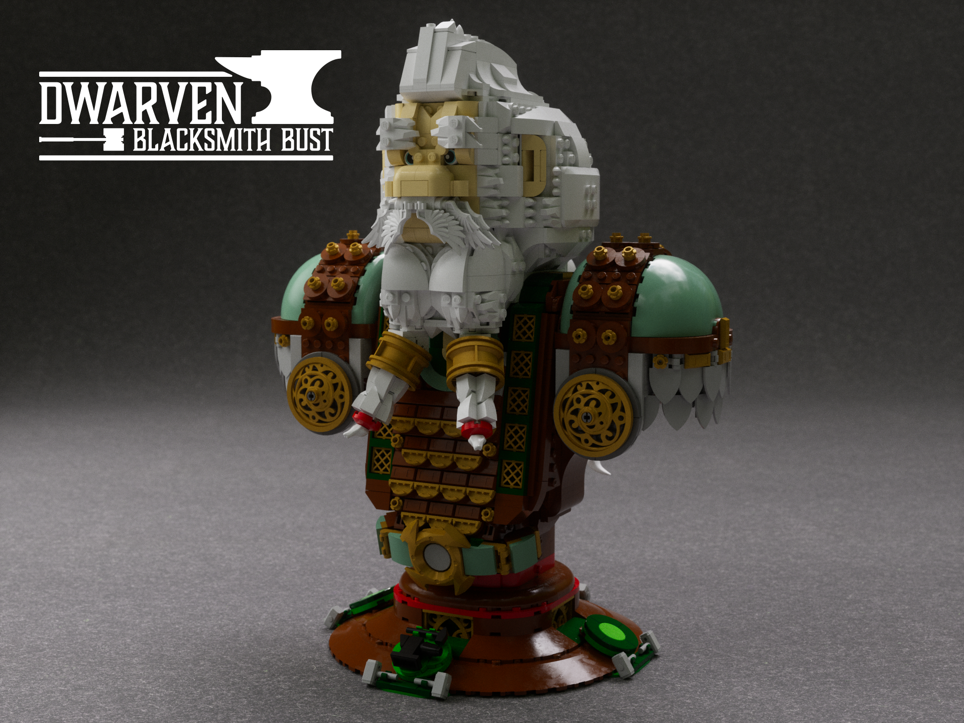 Dig into some fantasy with this character bust of a Dwarven Blacksmith. The base is designed to appear as carved wood with some details of hammers and an anvil emblem. Enjoy building the ornate pauldrons with chainmail, the chestplate armor and suspenders and the stoic face of this white-haired dwarf with his braided beard and ponytail.